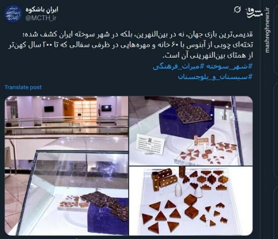 صفحه توئیتری وزارت میراثفرهنگی، گردشگری و صنایعدستی نوشت: قدیمیترین بازی جهان، نه در بینالنهرین، بلکه در شهر سوخته ایران کشف شده؛ تختهای چوبی از آبنوس با ۶۰ خانه و مهرههایی در ظرفی سفالی که تا ۲۰۰ سال کهنتر از همتای بینالنهرینی آن است.