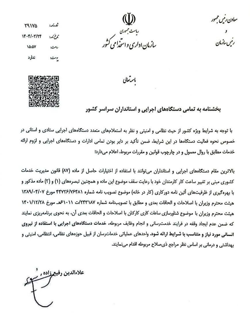 سازمان اداری و استخدامی کشور در بخشنامهای، اختیار اعطای دورکاری به کارکنان دولت با توجه به شرایط نظامی و امنیتی را به استاندارها واگذار کرد.