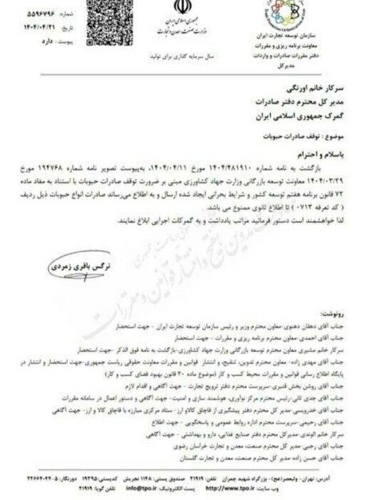 بر اساس نامه مدیرکل دفتر مقررات صادرات و واردات سازمان توسعه تجارت به گمرک، صادرات حبوبات تا اطلاع بعدی ممنوع اعلام شد.