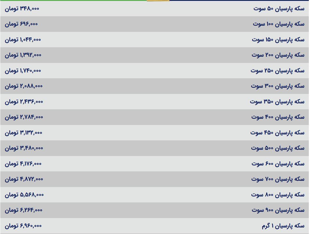 قیمت سکه پارسیان، امروز ۲۲ تیر ۱۴۰۴، در مقادیر ۵۰ صوت تا ۱گرم، به ثبت رسید.