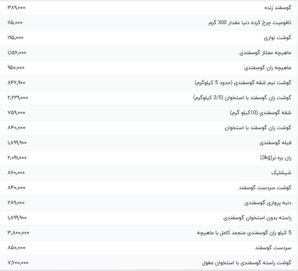 قیمت گوشت قرمز، امروز ۲۲ تیر ۱۴۰۴ شامل گوسفند زنده، ران گوسفندی، سردست گوسفندی، دنبه گوسفندی، قلوه گوسفندی، شقه گوسفندی، پرده گوسفندی، چرخ کرده گوسفندی بدون چربی و فیله گوسفندی اعلام شد.