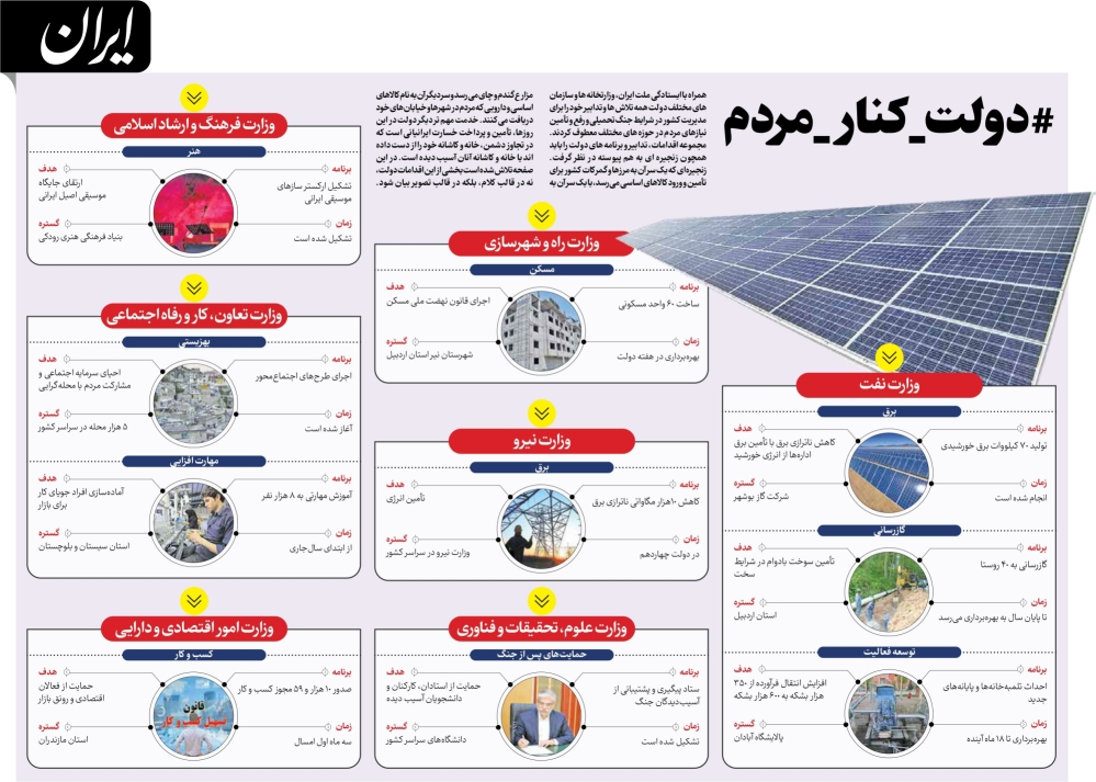 گروه سیاسی روزنامه ایران: همراه با ایستادگی ملت ایران، وزارتخانهها و سازمانهای مختلف دولت همه تلاشها و تدابیر خود را برای مدیریت کشور در شرایط جنگ تحمیلی و رفع و تأمین نیازهای مردم در حوزههای مختلف معطوف کردند. مجموعه اقدامات، تدابیر و برنامههای دولت را باید همچون زنجیره ای به هم پیوسته در نظر گرفت . زنجیرهای که یک سر آن به مرزها و گمرکات کشور برای تأمین و ورود کالاهای اساسی میرسد، یا یک سر آن به مزار ع گندم و چای میرسد و سر دیگر آن به نام کالاهای اساسی و دارویی که مردم در شهرها و خیابانهای خود دریافت میکنند. خدمت مهمتر دیگر دولت در این روزها، تأمین و پرداخت خسارت ایرانیانی است که در تجاوز دشمن، خانه و کاشانه خود را از دست دادهاند یا خانه و کاشانه آنان آسیب دیده است. در این دادهنما تلاش شده است بخشی از این اقدامات دولت، نه در قالب کلام، بلکه در قالب تصویر بیان شود.ایران آنلاین