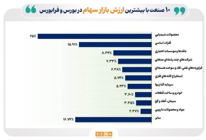 دادههای آماری مدیریت پژوهش، توسعه و مطالعات اسلامی سازمان بورس و اوراق بهادار، نشان میدهد: از میان صنایع فعال در بازار سرمایه، محصولات شیمیایی با ۲۵ درصد و ارزش بازار ۲۸، ۵۰۲، ۱۰۵ میلیارد ریال، بیشترین ارزش بازار سهام بورس تهران و فرابورس را در خرداد امسال به خود اختصاص داده است.
