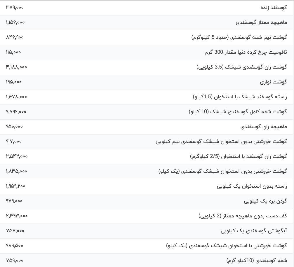 قیمت گوشت قرمز، امروز ۳۰ تیر ۱۴۰۴ شامل گوسفند زنده، ران گوسفندی، سردست گوسفندی، دنبه گوسفندی، قلوه گوسفندی، شقه گوسفندی، پرده گوسفندی، چرخ کرده گوسفندی بدون چربی و فیله گوسفندی اعلام شد.