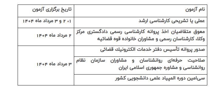 به گزارش ایرنا، در این اطلاعیه آمده است: آزمونهای «عملی یا تشریحی برخی رشتههای کارشناسی ارشد»، «معوق متقاضیان اخذ پروانه کارشناسی رسمی دادگستری مرکز وکلا، کارشناسان رسمی و مشاوران خانواده قوه قضائیه»، «صدور پروانه تأسیس دفتر خدمات الکترونیک قضائی»، «سومین آزمون صلاحیت حرفهای روانشناسان و مشاوران سازمان نظام روانشناسی و مشاوره جمهوری اسلامی ایران» و «سی امین دوره المپیاد علمی دانشجویی کشور» بر اساس برنامه زمانی اعلام شده و مندرج در جدول ذیل برگزار میشود.