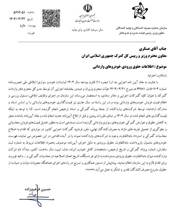ایران آنلاین: در نامه ارسالی این سازمان به گمرک آماده است: با توجه به آیین نامه اجرایی بند (ر) تبصره (۱) قانون بودجه سال ۱۴۰۴ (واردات خودروی سواری) ابلاغی هیات وزیران و صدور بخشنامه اجرایی آن توسط مدیر کل دفتر واردات گمرک، این سازمان در اجرای وظایف ابلاغی، مسئول بررسی و اعلام قیمت فروش خودروهای وارداتی بوده و در این راستا در سال جاری نیز قیمت گذاری خودروهای وارداتی را بر اساس اسناد و مدارک ارائه شده توسط شرکتهای وارد کننده از جمله پروانه گمرکی و اسناد ترخیص انجام داده است.