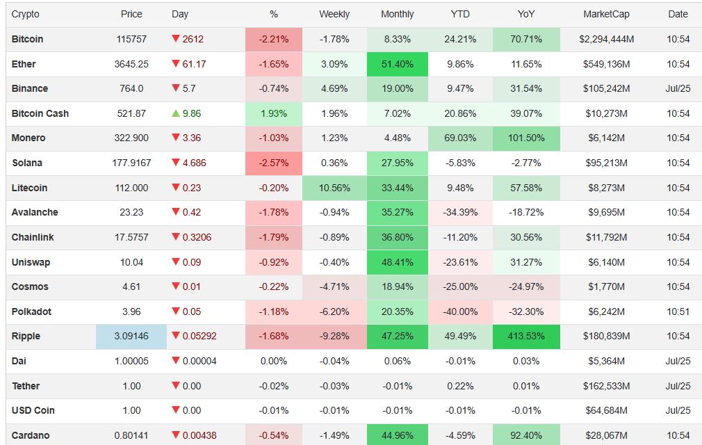 بازار ارزهای دیجیتال امروز جمعه ۳ مرداد ۱۴۰۴ با روندی نزولی همراه شد؛ بیتکوین، اتریوم و اغلب آلتکوینها کاهش قیمت را تجربه کردند.