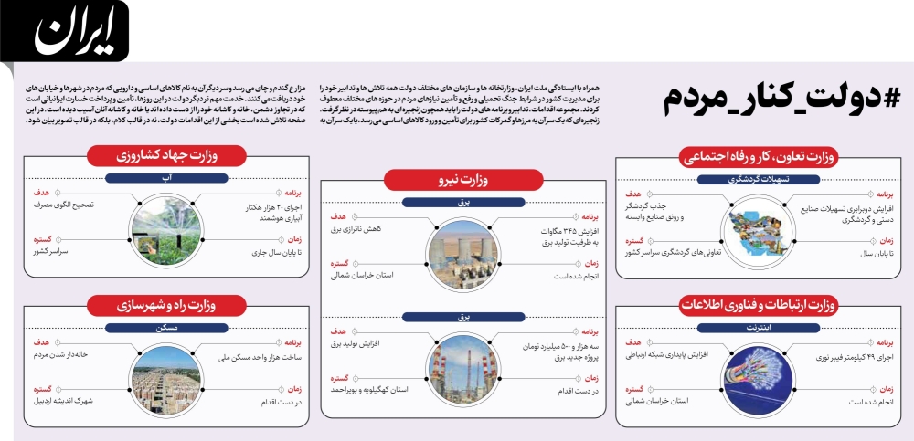 گروه سیاسی روزنامه ایران: همراه با ایستادگی ملت ایران، وزارتخانهها و سازمانهای مختلف دولت همه تلاشها و تدابیر خود را برای مدیریت کشور در شرایط جنگ تحمیلی و رفع و تأمین نیازهای مردم در حوزههای مختلف معطوف کردند. مجموعه اقدامات، تدابیر و برنامههای دولت را باید همچون زنجیره ای به هم پیوسته در نظر گرفت . زنجیرهای که یک سر آن به مرزها و گمرکات کشور برای تأمین و ورود کالاهای اساسی میرسد، یا یک سر آن به مزار ع گندم و چای میرسد و سر دیگر آن به نام کالاهای اساسی و دارویی که مردم در شهرها و خیابانهای خود دریافت میکنند. خدمت مهمتر دیگر دولت در این روزها، تأمین و پرداخت خسارت ایرانیانی است که در تجاوز دشمن، خانه و کاشانه خود را از دست دادهاند یا خانه و کاشانه آنان آسیب دیده است. در این دادهنما تلاش شده است بخشی از این اقدامات دولت، نه در قالب کلام، بلکه در قالب تصویر بیان شود.