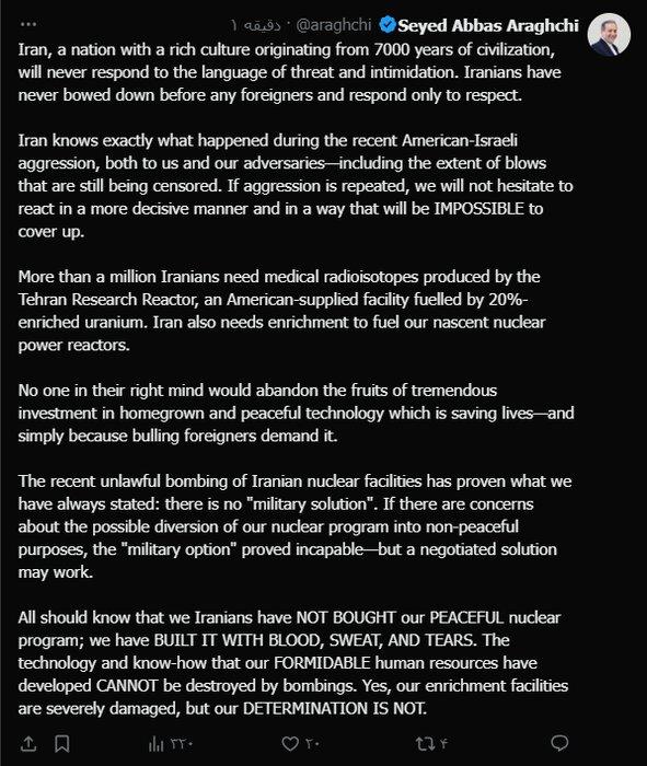 به گزارش ایرنا، سید عباس عراقچی در حساب کاربری خود در شبکه اجتماعی ایکس (توئیتر سابق) نوشت: ایران کشوری با فرهنگی غنی و ریشهدار در هفت هزار سال تمدن، هرگز به زبان تهدید و ارعاب پاسخ نخواهد داد. ایرانیان هرگز برابر بیگانگان سر خم نکردهاند و تنها به احترام پاسخ میدهند.