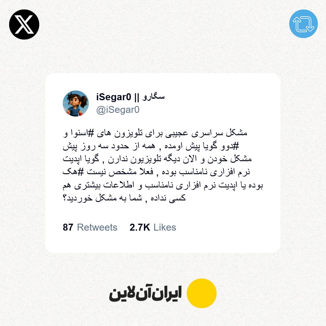 متأسفانه در ساعات اخیر، تعدادی از تلویزیونهای هوشمند اسنوا با اختلال نرمافزاری مواجه شدهاند. این مشکل ناشی از برخی ناهماهنگیها در بستر ارتباطی است و تیم فنی در حال رفع آن است. از مشتریان عزیز میخواهیم تا اطلاع ثانوی از اتصال دستگاه به اینترنت خودداری کنند. این اختلال ظرف حداکثر ۴۸ ساعت آینده برطرف خواهد شد و هیچگونه آسیب سختافزاری متوجه تلویزیونهای کاربران نیست.