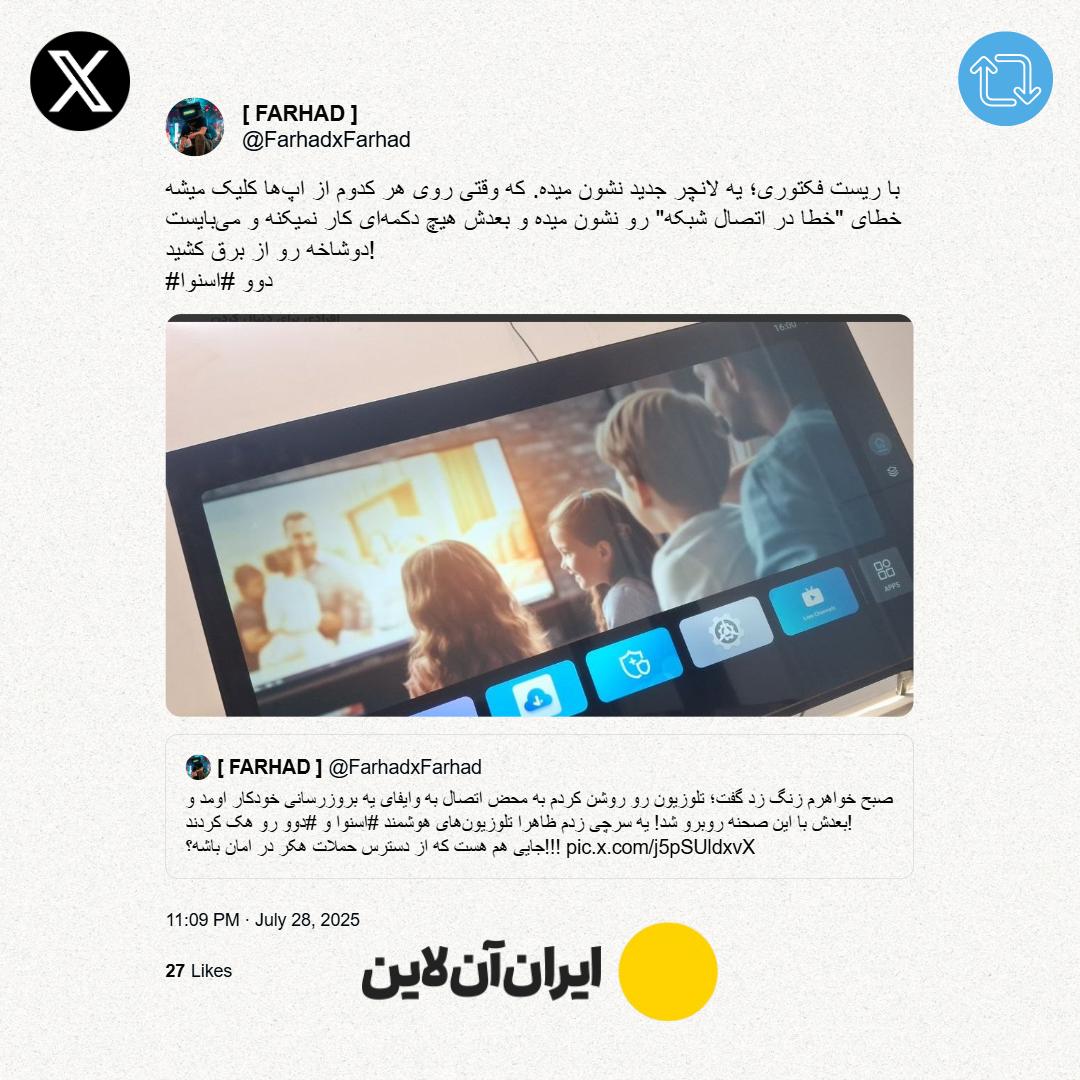 فاطمه اسکندری - گروه راستیآزمایی ایران آنلاین: از صبح دوشنبه، تعدادی از کاربران تلویزیونهای هوشمند اسنوا و دوو با مشکل جدی در عملکرد دستگاههای خود مواجه شدند. طبق گزارشهای موجود در رسانههای اجتماعی، این اختلال در میان تلویزیونهای متصل به اینترنت از این دو برند و پس از دریافت یک پیام بهروزرسانی نرمافزاری ایجاد و باعث شد از دستگاهها از کار بیفتند.