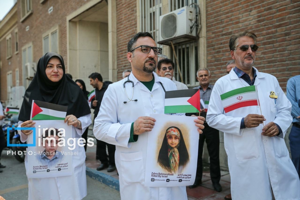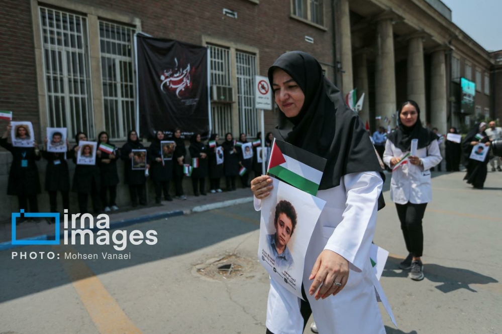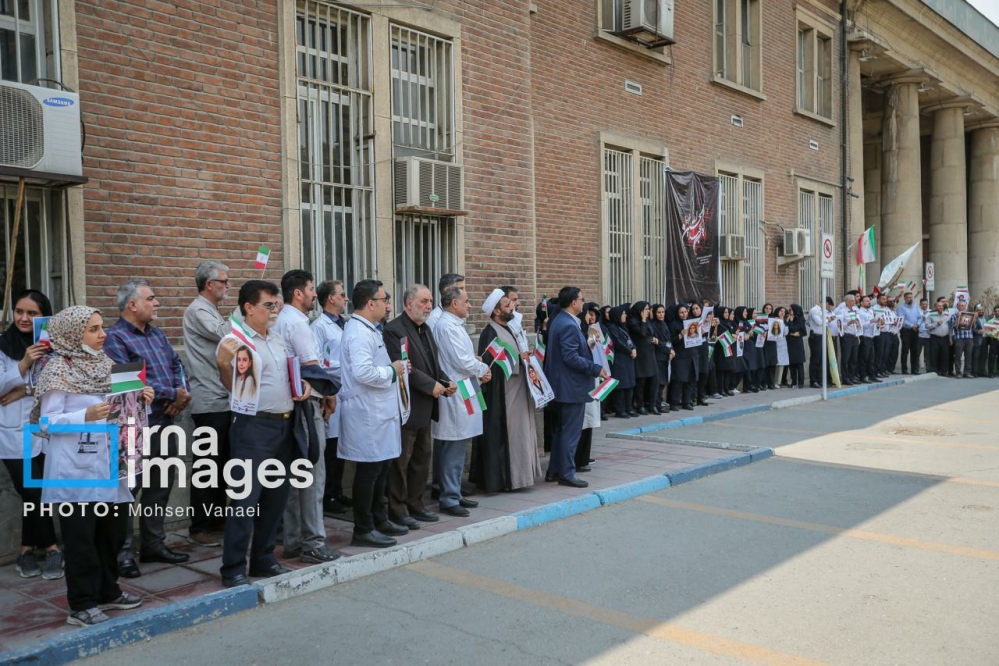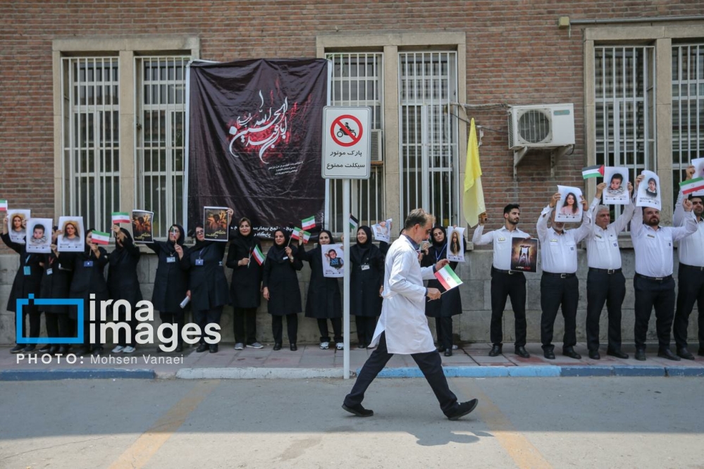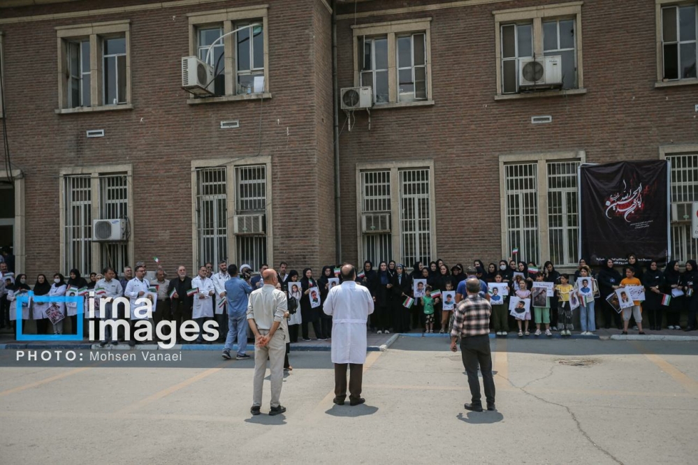تجمع سکوت اعتراضی با عنوان «از کربلای ایران تا کربلای غزه؛ یادمان شهدای کودک ایران و غزه»، ظهر چهارشنبه (۸ مرداد ۱۴۰۴) همزمان با سالروز شهادت مظلومانه حضرت رقیه(س) و در واکنش به جنایات اخیر رژیم صهیونی علیه کودکان با حضور دانشگاهیان، اعضای هیئت علمی، دانشجویان و کادر درمان دانشگاه علوم پزشکی در بیمارستان امام خمینی(ره) برگزار شد.