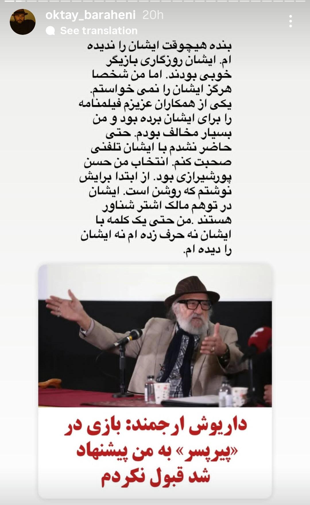 این اظهارات با واکنش تندی از سوی عوامل سازنده این فیلم روبرو شد. تا جایی که اکتای براهنی کارگردان فیلم "پیرپسر" در صفحه خود در شبکه اجتماعی اینستاگرام عنوان کرد که بنده هیجوقت ایشان را ندیدهام ایشان روزگاری بازیگر خوبی بودند اما من شخصا هرگز ایشان را نمی خواستم، یکی از همکاران عزیزم فیلمنامه را برای ایشان برده بود و من بسیار مخالف بودم حتی حاضر نشدم با ایشان تلفنی صحبت کنم انتخاب من حسن پورشیرازی بود از ابتدا برایش نوشتم که روشن است ایشان در توهم مالك اشتر شناور هستند . من حتى يك كلمه با ایشان نه حرف زده ام نه ایشان را دیده ام.»