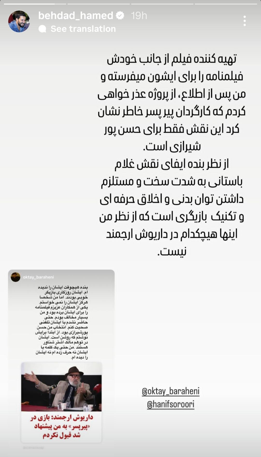 همچنین، حامد بهداد از بازیگران فیلم "پیرپسر" در پاسخ به ارجمند در صفحه خود در اینستاگرام نوشت: «تهیه کننده فیلم از جانب خودش فیلمنامه را برای ایشون میفرسته و من پس از اطلاع از پروژه عذر خواهی کردم که کارگردان «پیرپسر» خاطر نشان کرد این نقش فقط برای حسن پورشیرازی است.