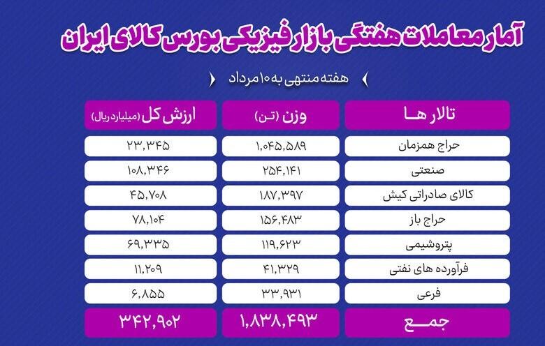 در معاملات هفته گذشته (هفته منتهی به ۱۰ مرداد) بازار فیزیکی بورس کالای ایران یک میلیون و ۸۳۸ هزار و ۴۹۳ تن انواع محصول به ارزش ۳۴.۳ هزار میلیارد تومان دادوستد شد.