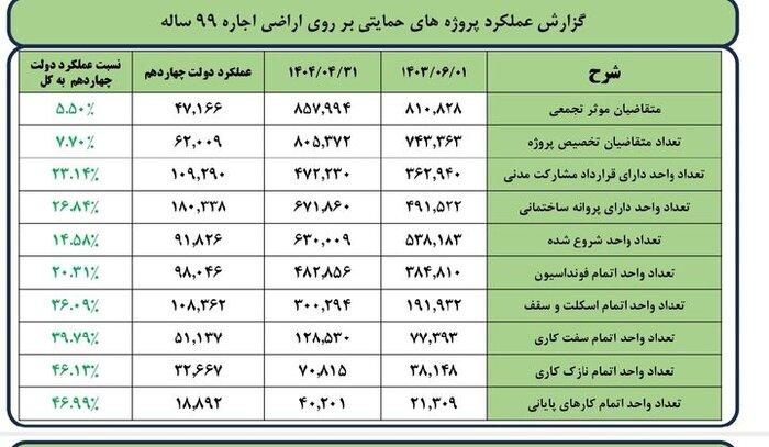 بر اساس این گزارش، تعداد متقاضیان موثر پروژه های حمایتی بر روی اراضی ۹۹ ساله در تاریخ ۳۱ شهریور ۱۴۰۳ معادل ۸۱۰ هزار و ۸۲۸ نفر بوده است. این تعداد در پایان تیر امسال و در ۱۱ ماه دولت چهاردهم به ۸۵۷ هزار و ۹۹۴ نفر رسید.