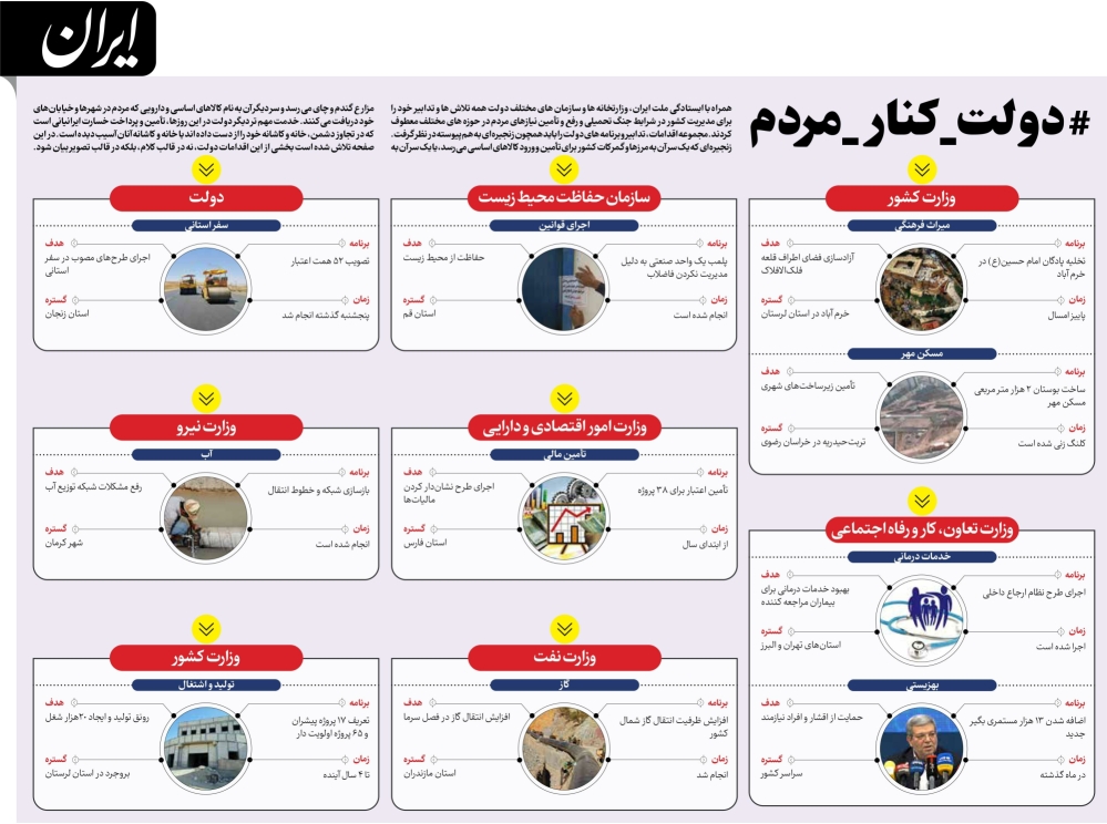 گروه سیاسی روزنامه ایران: همراه با ایستادگی ملت ایران، وزارتخانهها و سازمانهای مختلف دولت همه تلاشها و تدابیر خود را برای مدیریت کشور در شرایط جنگ تحمیلی و رفع و تأمین نیازهای مردم در حوزههای مختلف معطوف کردند. مجموعه اقدامات، تدابیر و برنامههای دولت را باید همچون زنجیره ای به هم پیوسته در نظر گرفت . زنجیرهای که یک سر آن به مرزها و گمرکات کشور برای تأمین و ورود کالاهای اساسی میرسد، یا یک سر آن به مزار ع گندم و چای میرسد و سر دیگر آن به نام کالاهای اساسی و دارویی که مردم در شهرها و خیابانهای خود دریافت میکنند. خدمت مهمتر دیگر دولت در این روزها، تأمین و پرداخت خسارت ایرانیانی است که در تجاوز دشمن، خانه و کاشانه خود را از دست دادهاند یا خانه و کاشانه آنان آسیب دیده است. در این دادهنما تلاش شده است بخشی از این اقدامات دولت، نه در قالب کلام، بلکه در قالب تصویر بیان شود.
