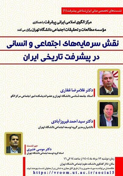 مرکز الگوی اسلامی ایرانی پیشرفت با همکاری موسسه مطالعات و تحقیقات اجتماعی دانشگاه تهران، اولین نشست از سلسله نشست‌های تخصصی مبانی ایران‌شناختی پیشرفت را با موضوع نقش سرمایه‌های اجتماعی و انسانی در پیشرفت تاریخی ایران برگزار می‌‌کند.