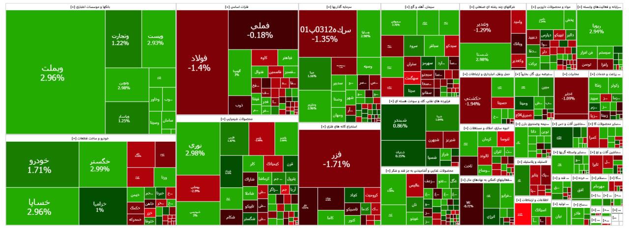 امروز نقشه بازار تقریبا به صورت نصف نصف میان نمادهای مثبت و منفی تقسیم شد و ۳۰۴ نماد مثبت و ۳۴۱ نماد منفی بودند.