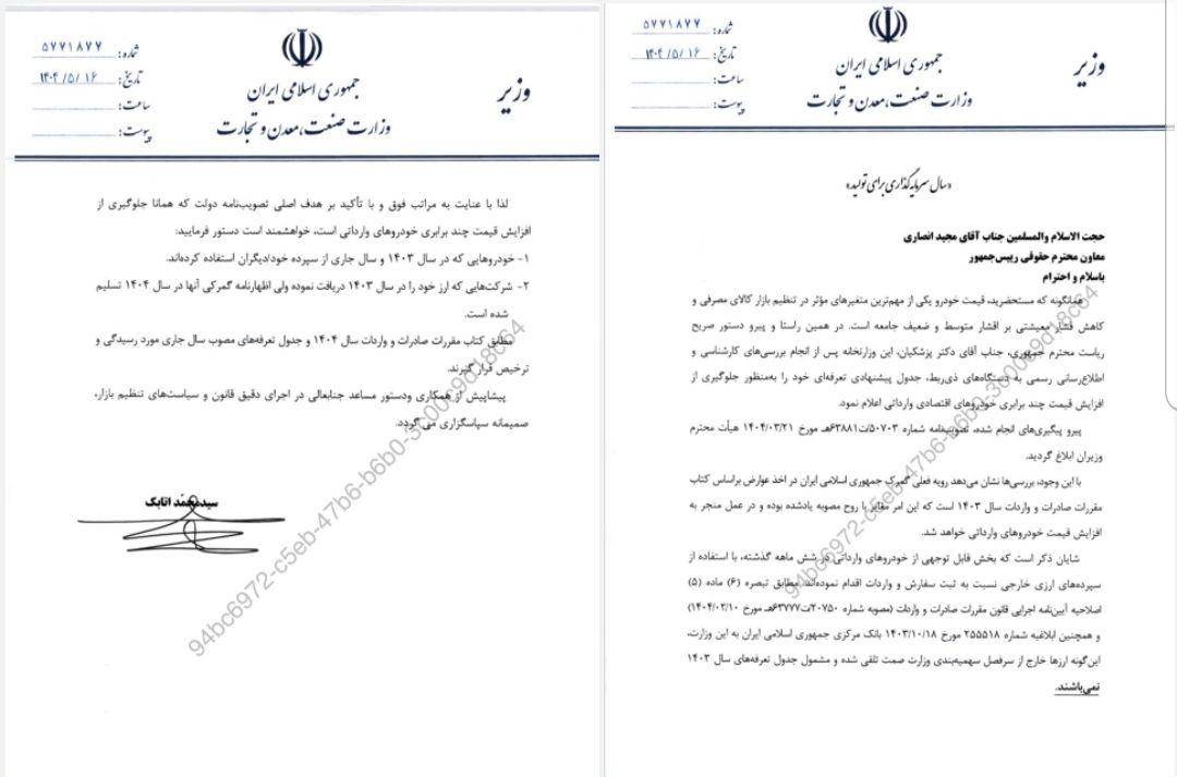 ایران آنلایندر نامه سید محمد اتابک به مجید انصاری آمده است: قیمت خودرو یکی از مهمترین متغیرهای مؤثر در تنظیم بازار کالای مصرفی و کاهش فشار معیشتی بر اقشار متوسط و ضعیف جامعه است. در همین راستا و پیرو دستور صریح ریاست دکتر پزشکیان این وزارتخانه پس از انجام بررسی های کارشناسی و اطلاع رسانی رسمی به دستگاه های ذی ربط، جدول پیشنهادی تعرفه ای خود را به منظور جلوگیری از افزایش چند برابری خودروهای اقتصادی وارداتی اعلام کرد.