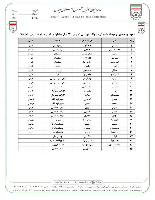 به گزارش ایرنا، تیم امید ایران که مدتی است تمرینات خود را در کمپ تیمهای ملی برگزار میکرد در نهایت فهرست ۲۶ بازیکن را برای این اردو و رویداد پیش رو رسانهای کرد.