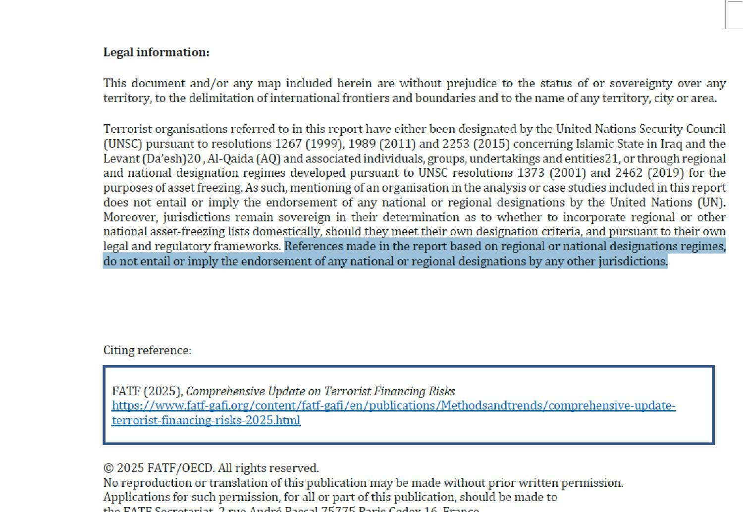 گفتنی است بر اساس قطعنامه ۱۳۷۳ سازمان ملل متحد هر کشوری میتواند در لیست ملی خود اشخاص، گروهها و کشورها را بهعنوان تروریسم و تأمینکننده مالی تروریسم معرفی کند و ملاک عمل FATF برای شناختن گروههای تروریستی، قطعنامه ۱۲۶۷ سازمان ملل است.