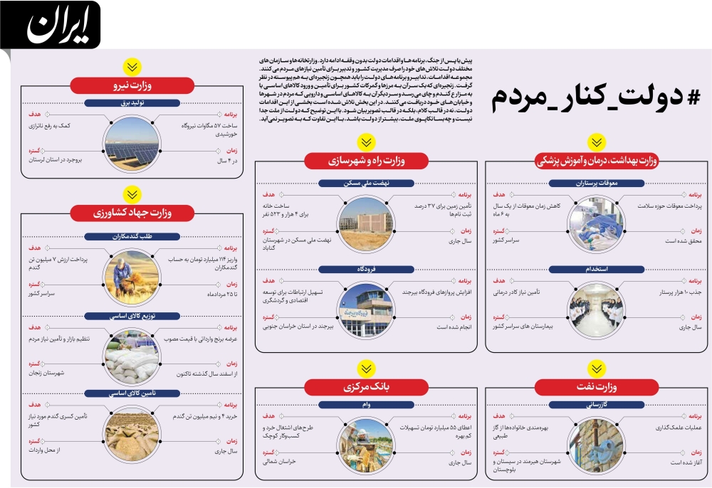 گروه سیاسی روزنامه ایران: همراه با ایستادگی ملت ایران، وزارتخانهها و سازمانهای مختلف دولت همه تلاشها و تدابیر خود را برای مدیریت کشور در شرایط جنگ تحمیلی و رفع و تأمین نیازهای مردم در حوزههای مختلف معطوف کردند. مجموعه اقدامات، تدابیر و برنامههای دولت را باید همچون زنجیره ای به هم پیوسته در نظر گرفت . زنجیرهای که یک سر آن به مرزها و گمرکات کشور برای تأمین و ورود کالاهای اساسی میرسد، یا یک سر آن به مزار ع گندم و چای میرسد و سر دیگر آن به نام کالاهای اساسی و دارویی که مردم در شهرها و خیابانهای خود دریافت میکنند. خدمت مهمتر دیگر دولت در این روزها، تأمین و پرداخت خسارت ایرانیانی است که در تجاوز دشمن، خانه و کاشانه خود را از دست دادهاند یا خانه و کاشانه آنان آسیب دیده است. در این دادهنما تلاش شده است بخشی از این اقدامات دولت، نه در قالب کلام، بلکه در قالب تصویر بیان شود.