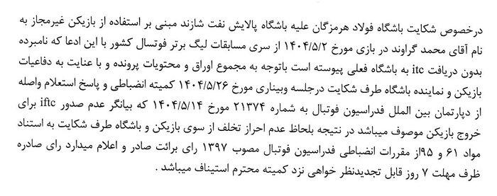 رای رد دعوی باشگاه فولاد هرمزگان به طرفیت پالایش نفت شازند به شرح زیر است: