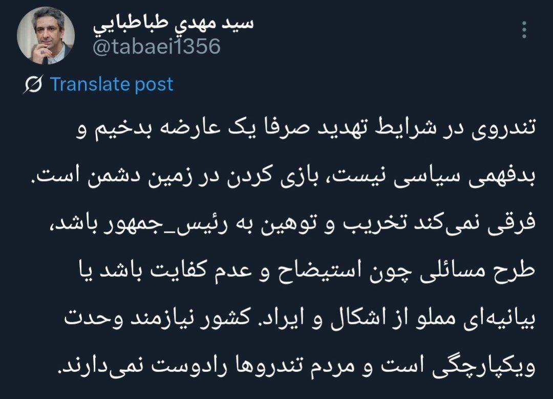 ایران آنلاین: سید مهدی طباطبایی در حساب کاربری خود در شبکه ایکس نوشت: تندروی در شرایط تهدید صرفا یک عارضه بدخیم و بدفهمی سیاسی نیست، بازی کردن در زمین دشمن است. فرقی نمیکند تخریب و توهین به رئیسجمهور باشد، طرح مسائلی چون استیضاح و عدم کفایت باشد یا بیانیهای مملو از اشکال و ایراد. کشور نیازمند وحدت ویکپارچگی است و مردم تندروها رادوست نمیدارند.