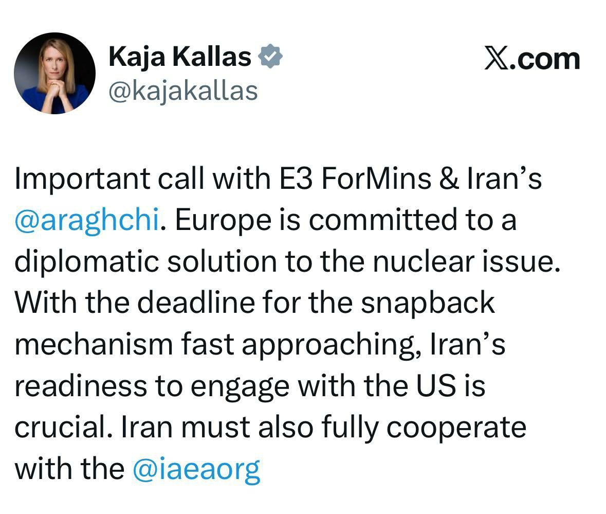 کایا کالاس، نخستوزیر استونی، پس از تماس تلفنی مشترک با وزرای خارجه انگلیس، فرانسه و آلمان با سیدعباس عراقچی، اعلام کرد که اروپا همچنان متعهد به راهحل دیپلماتیک برای موضوع هستهای ایران است.