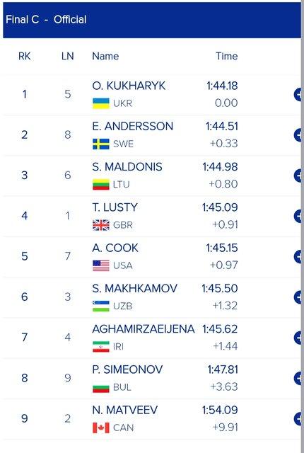 او در مجموع با برگزاری فینال A و B مسابقات، جایگاهی بهتر از بیست و پنجمی جهان به دست نمیآورد.