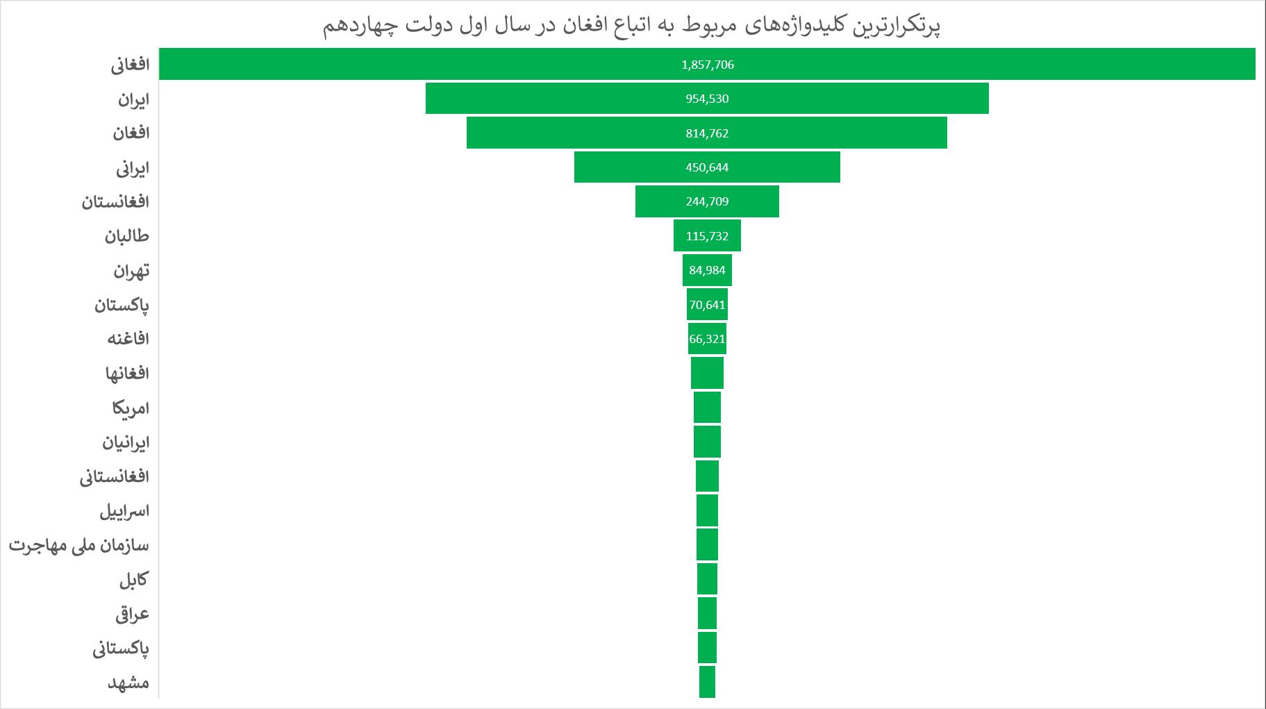هشتگهای دیگری نیز در این بازه علیه حضور افغانها منتشر شده که میتوان به اخراج بی قید و شرط اتباع افغانستانی اشاره کرد. در مجموع، بررسی یک ساله توئیتر فارسی نشان میدهد علاوه بر اینکه موضوع اتباع خارجی و افاغنه مساله مهمی برای افکار عمومی بوده، عمده محتوا در این خصوص به خروج افغانها از ایران و تقابل با این افراد مربوط بوده است.