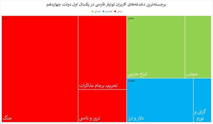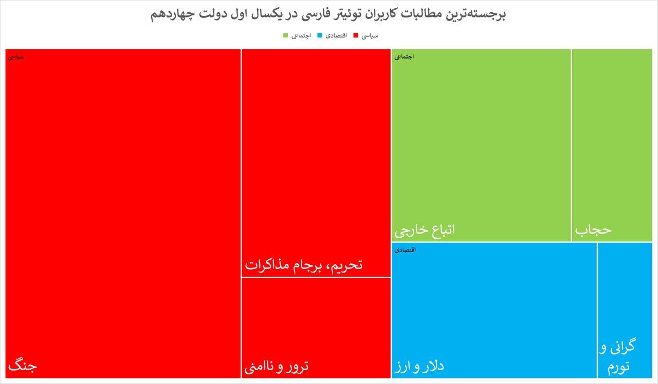 ایران ـ آنلاین: بررسی دادههای مربوط به دغدغههای افکار عمومی در یک سال نخست دولت چهاردهم نشان میدهد «جنگ»، موضوع «اتباع خارجی» و همچنین «مذاکره و تحریم» برجستهترین و پرتکرارترین موضوعاتی است که کاربران توئیتر فارسی به آنها پرداخته و مضامینی را نشر و بازنشر دادهاند.