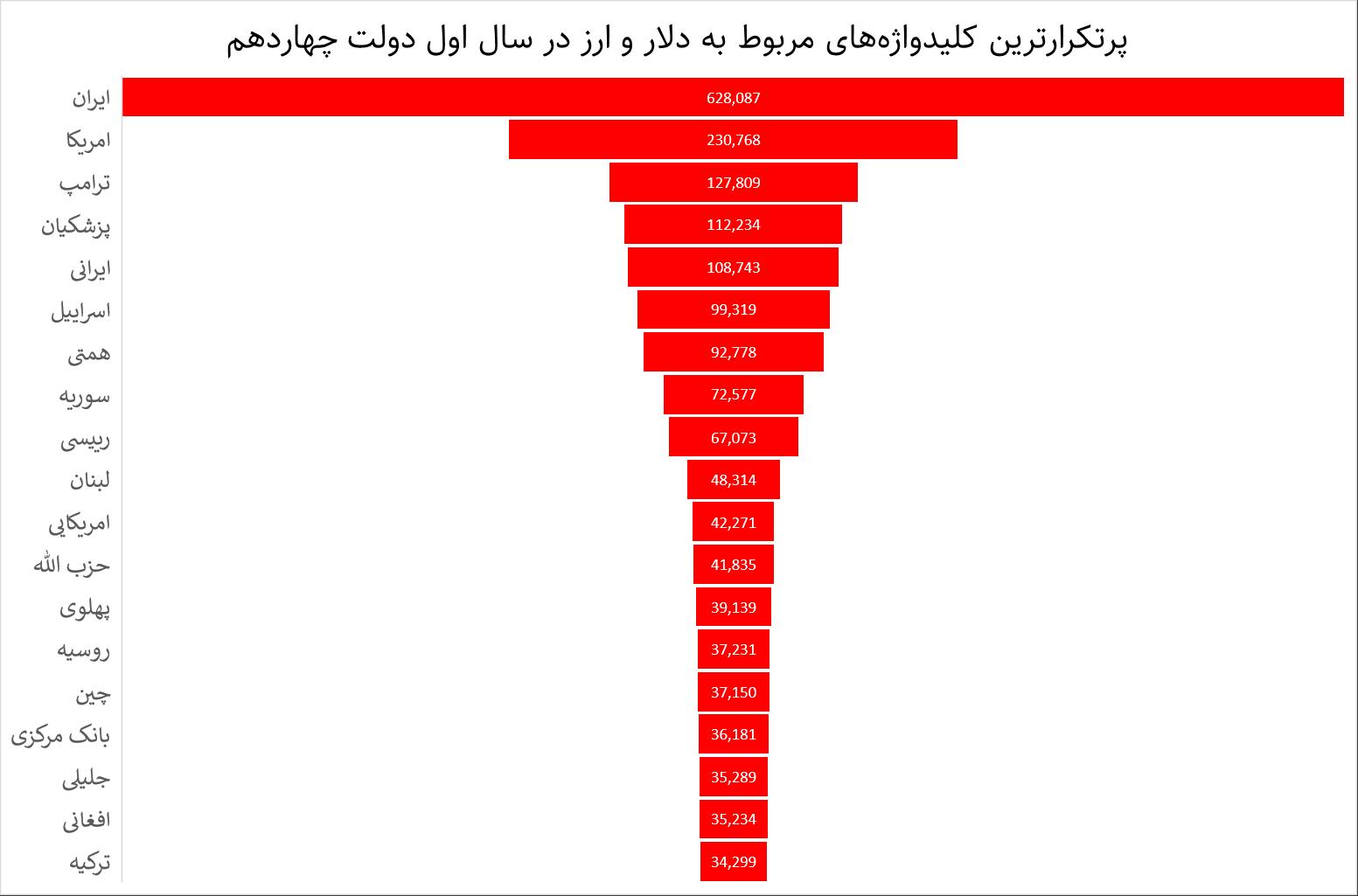 ترامپ و پزشکیان بیشترین تکرار و توجه را پیرامون مساله دلار رو ارز در توئیتر داشتند؛ گویی کاربران توئیتر نوسانات ارزی و رفع مشکلات مربوط به افزایش دلار را به این دو شخصیت سیاسی مرتبط دانستهاند.