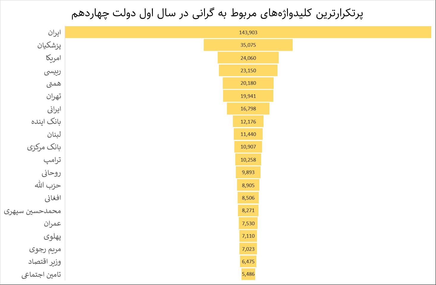 گرانی و بحثهای مربوط به افزایش قیمت از دیگر موضوعات ترند و برجسته شده کاربران مجازی بود که در توئیتر فارسی نیز بازتاب گستردهای پیدا کرد. در این بخش نیز همانند موضوع اینترنت و فیلترینگ، شخص اول مورد اشاره کاربران، پزشکیان بوده که بیشترین تکرار و همپوشانی میان نام او و بحث تورم و گرانی اتفاق افتاده است.