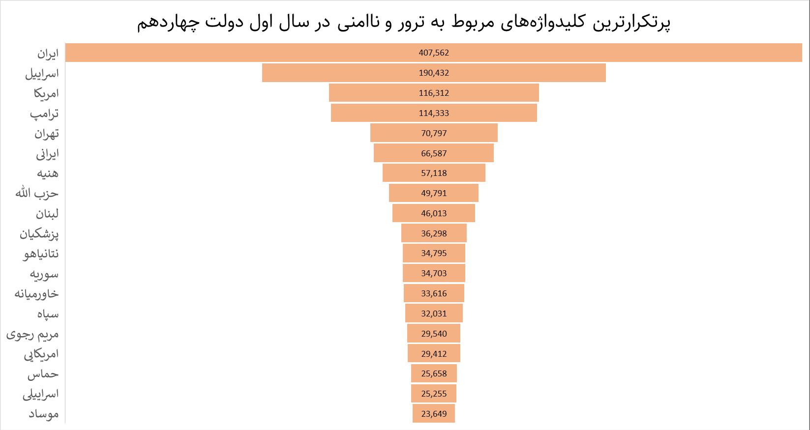 بحث ترور و متعاقب آن ناامنی، یکی از جالبترین موضوعات برجسته شده در میان کاربران توئیتر بود که با کلیدواژههایی چون ترور، ناامنی حجم قابل توجهی از دیتای سالانه را به خود اختصاص دادند. در این مساله نیز بررسی کلیدواژههای پرتکرار، اسرائیل و آمریکا را به عنوان پرتکرارترین مناطقی که بحث ترور پیرامون آنها مطرح شده، برجسته کرده است.