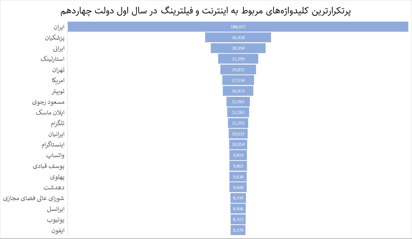 دومین موضوع پرتکرار در حوزه فناوری و اینترنت به بحث اینترنت استارلینک و ایلان ماسک مربوط میشود که جزو سه کلیدواژه نخست پرتکرار در این بخش تخمین زده شده است. بحث این کاربران درباره استارلینک بیشتر در سه موضوع کلی قابل طبقهبندی است: نخست پس از گمانهزنیهای گسترده در خصوص اینترنت طبقاتی، بحث استارلینک بیش از گذشته طرح و بحث شد. دوم همزمان با قطعی اینترنت بار دیگر بحث اینترنت استارلینک بالا گرفت و حتی شایعات زیادی از اتصال برخی کاربران فارسی زبان داخلی به این فناوری شنیده شد که همزمان با جنگ اسرائیل علیه ایران تشدید شد؛ به طور کلی استارلینک به مثابه اینترنت آزاد از سوی کاربران توئیتر، موضوعی جذاب و مورد توجه بوده است.