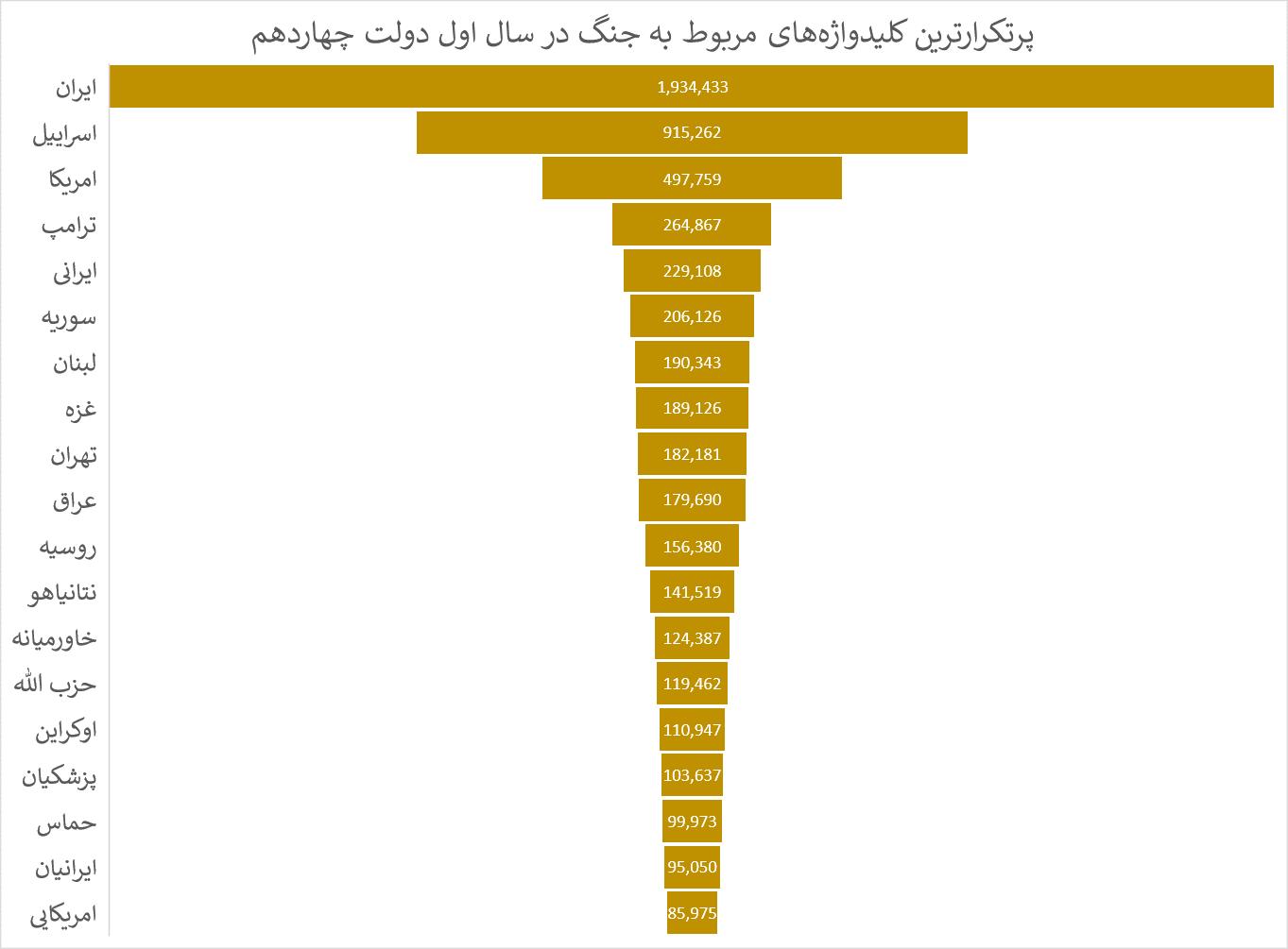 پرتکرارترین محتوای مربوط به جنگ در توئیتر مربوط به جنگ ایران و اسرائیل بوده که حجم قابل توجه محتوای مربوط را به خود اختصاص داده است. علاوه بر جنگ ایران و اسرائیل، جنگهای مربوط به آمریکا، سوریه، لبنان، غزه، عراق، اوکراین و حماس بیشترین توجهات کاربران این بسترها را به خود جلب کرده است.
