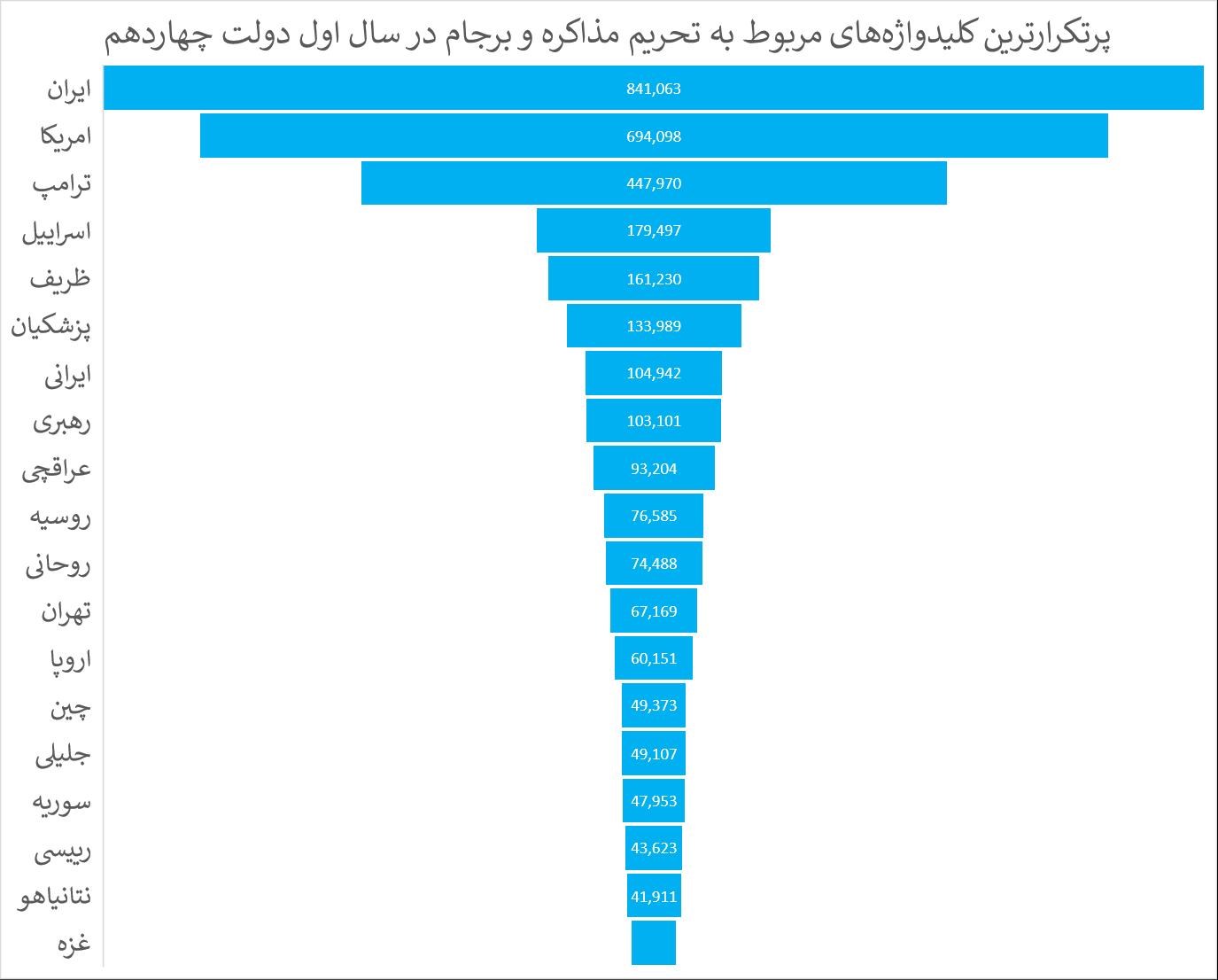 بررسی کلیدواژههای به کار رفته در این موضوع، نشان میدهد بیشترین توجهات در خصوص رفع تحریمها، موضوع برجام و مذاکره معطوف به آمریکا و شخص ترامپ بوده که بیشترین تکرار و تاکید کاربران را به همراه داشته است.