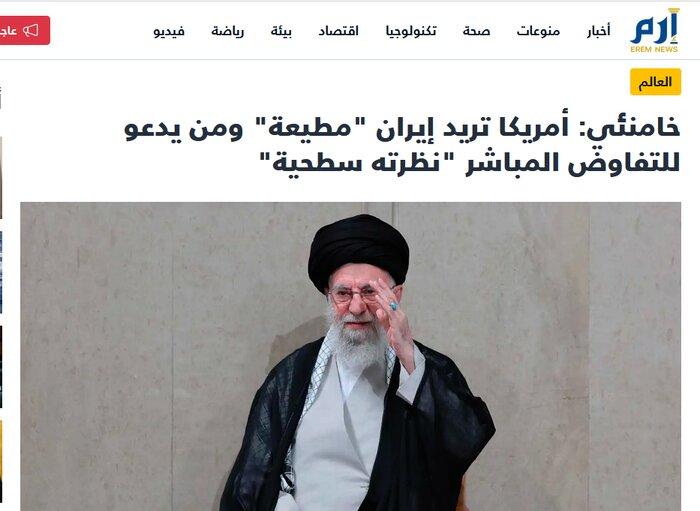 پایگاه خبری «إرم نیوز» نیز با انتشار بخشهایی از بیانات رهبر انقلاب اسلامی به نقل از ایشان نوشت: آمریکا میخواهد ایران گوش به فرمان آن باشد؛ کسانی که خواهان مذاکرات مستقیم با آمریکا هستند، ظاهربین هستند.