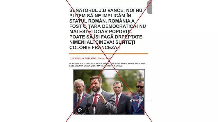 ایران آنلاین: دیانا شوشوکا، نماینده راست افراطی رومانی پستی در شبکه‌های اجتماعی منتشر کرده که القا می‌کند جی‌دی ونس از مردم رومانی خواسته تا با «انقلاب» خود را از سلطه فرانسه آزاد کنند. او تصویری از یک مطلب خبری منتشر کرد که به نظر می‌رسید از وب‌سایت معتبر «اروپا لیبرا» (رادیو اروپای آزاد، بخش رومانی) گرفته شده باشد.