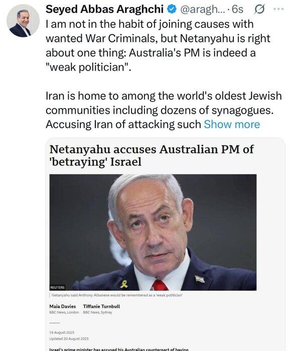 وزیر امور خارجه در واکنش به اقدام دولت استرالیا در اخراج سفیر ایران در این کشور و تعلیق فعالیت سفارتخانه خود در تهران در شبکه ایکس نوشت: من در هیچ‌ موضوعی با جنایتکاران جنگی تحت تعقیب نظر موافق نداشته‌ام، اما نتانیاهو در یک مورد درست می‌گوید: نخست‌وزیر استرالیا واقعاً یک «سیاستمدار ضعیف» است.