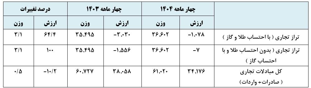 مدیرکل دفتر برنامه‌ریزی و پایش سازمان توسعه تجارت ایران گفت: صادرات کالا طی چهار ماهه امسال به ۴۸ میلیون و ۸۱۱ هزار تن و ارزش ۱۶ میلیارد و ۵۴۹ میلیون دلار رسیده که نسبت به مدت مشابه سال قبل ۱.۵ درصد از لحاظ وزن افزایش و ۵.۵ درصد از نظر ارزشی کاهش داشته است.