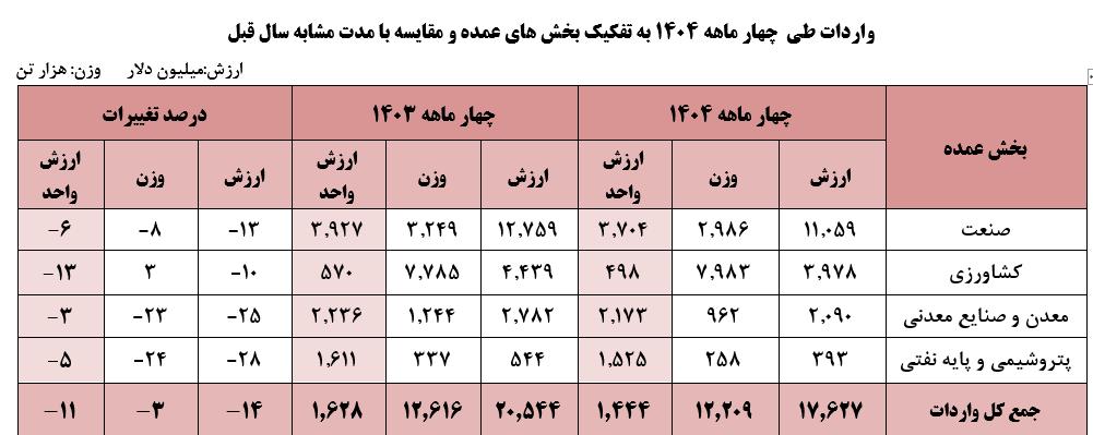 مدیرکل دفتر برنامه‌ریزی و پایش سازمان توسعه تجارت ایران ادامه داد: واردات کشور طی چهار ماهه ۱۴۰۴ به ۱۲ میلیون و ۲۰۹هزار تن و به ارزش ۱۷ میلیارد و ۲۹ میلیون دلار رسیده است که نسبت به مدت مشابه سال قبل سه درصد از نظر وزن و ۱۴ درصد از نظر ارزش کاهش داشته است.