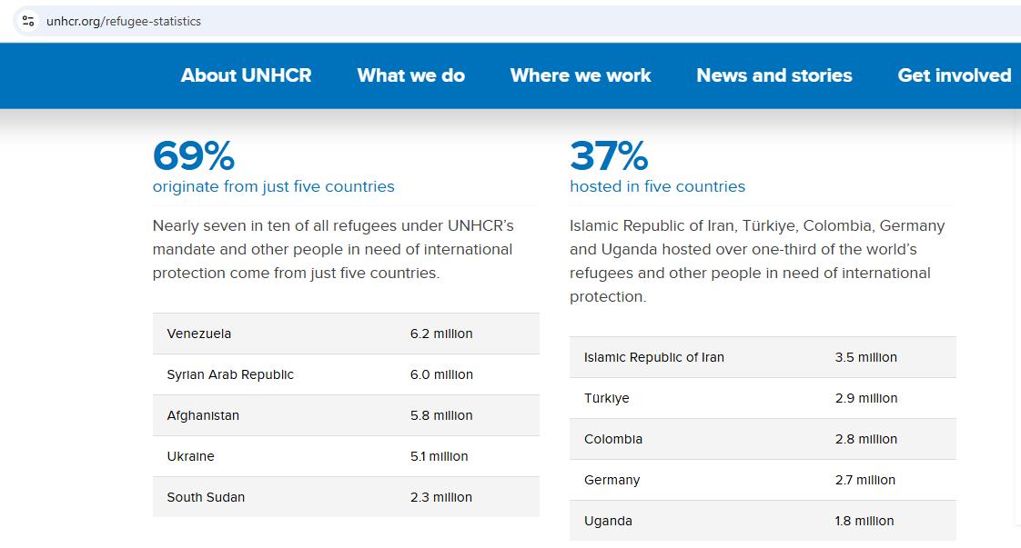 بر اساس داده های رسمی کمیساریای عالی پناهندگان سازمان ملل متحد در سال ۲۰۲۴ ایران با حدود ۳٫۵ میلیون پناهنده بیشترین جمعیت پناهنده را در دنیا دارد که بیشتر آن را پناهندگان افغانستانی تشکیل داده اند ترکیه و آلمان با ۲/۹ و ۲/۷ میلیون پناهنده در جایگاههای بعدی هستند.