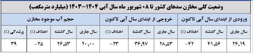 بر اساس آخرین آمار، از ابتدای سال آبی تا تاریخ هشتم شهریورماه از وضعیت سدهای کشور حجم آب موجود در مخازن کل سدهای مهم تنها ۳۹ درصد است.