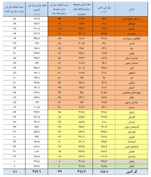 همچنین ارتفاع کل ریزشهای جوی کشور معادل ۱۴۸.۵ میلیمتر است. این مقدار بارندگی نسبت به میانگین دورههای مشابه درازمدت (۲۴۴.۷ میلیمتر) ۳۹ درصد کاهش و نسبت به دوره مشابه سال آبی گذشته (۲۴۹.۶ میلیمتر) ۴۱ درصد کاهش را نشان میدهد.