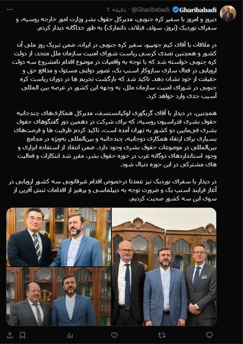 ایران آنلاین: کاظم غریب آبادی در حساب کاربری خود در شبکه اجتماعی ایکس (توئیتر سابق) نوشت: دیروز (یکشنبه) و امروز (دوشنبه) با سفیر کره جنوبی، مدیرکل حقوق بشر وزارت امور خارجه روسیه و سفرای نوردیک (نروژ، سوئد، فنلاند، دانمارک) به طور جداگانه دیدار کردم.