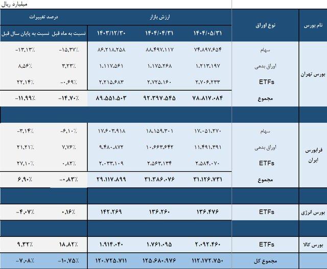 ایران آنلاینداده‌های منتشر شده از سوی سازمان بورس و اوراق بهادار حاکی از آن است که مجموع کل ارزش بازار اوراق بهادار در پایان مرداد سال جاری به ۱۱ هزار و ۲۱۷ همت رسید که نسبت به ماه قبل خود (پایان تیرماه ۱۴۰۴) معادل ۱۰.۷ درصد کاهش داشته و در قیاس با پایان سال گذشته (اسفندماه ۱۴۰۳) معادل هفت درصد ریزش را نشان می‌دهد.