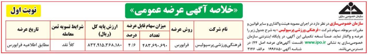 ایران آنلاینسازمان‌خصوصی‌سازی آگهی (نوبت اول) شرایط عرضه بخشی از سهام باشگاه فرهنگی ورزشی پرسپولیس را منتشر کرد که به شرح زیر است:
